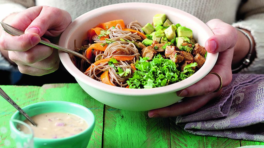 Vegan, schnell gemacht und glutenfrei: Diese Bowl vereint Avocado, Grünkohl, Süßkartoffeln und Koriander zu einem harmonischen Genuss. Dazu noch eine